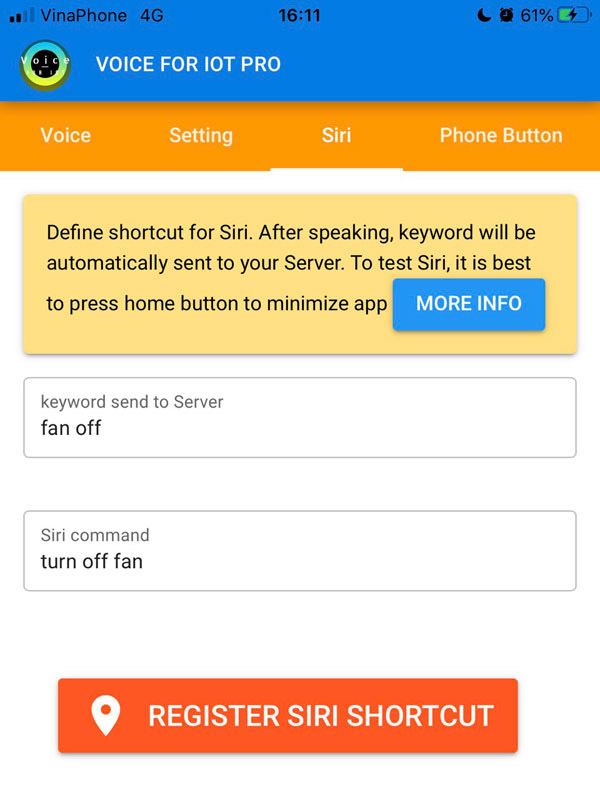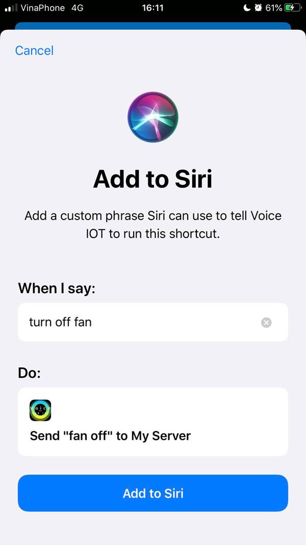 To test, speak "Hey siri turn off fan", app will be launched and send "fan off" to your server through your server setting